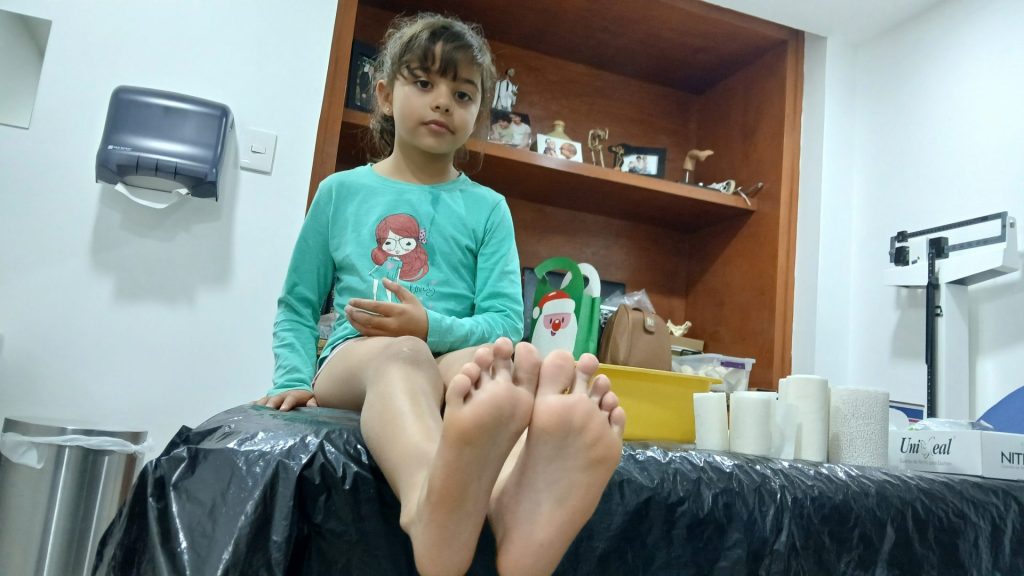 Zereth fue diagnosticada con pie equino varo, una condición que afecta la formación del pie y puede dificultar su desarrollo normal. Afortunadamente, existe un tratamiento efectivo conocido como el método Ponseti, que ha demostrado ser exitoso para corregir esta afección. Desde su diagnóstico, hemos realizado un seguimiento constante y, tras tres citas de yesos, hoy Zereth ha recibido su tercera y última fibra de vidrio correctiva.